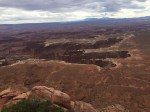Ik dek de tafel buiten en het begint weer te stippen. Dikke druppels, dus we gaan toch maar binnen ontbijten. Een dik wit wolkendek bedekt de zon, desondanks is het toch lekker warm. Na het ontbijt gaan we op pad. In een half uurtje staan we bij de ingang van Dead Horse State Park, dit is een staatspark net voor de ingang van Canyonlands, waar je uitzicht hebt op de Coloradorivier die meandert door de canyon. Het uitzichtpunt heet Dead Horse Point. We parkeren bij het bezoekerscentrum en maken wat foto’s. We hebben ons voorgenomen om na de uitputtende wandeling van gisteren, vandaag lekker rustig aan te doen. We rijden naar de uitzichtpunten, maken daar foto’s en dan rijden we weer naar het volgende uitzichtpunt om foto’s te maken.