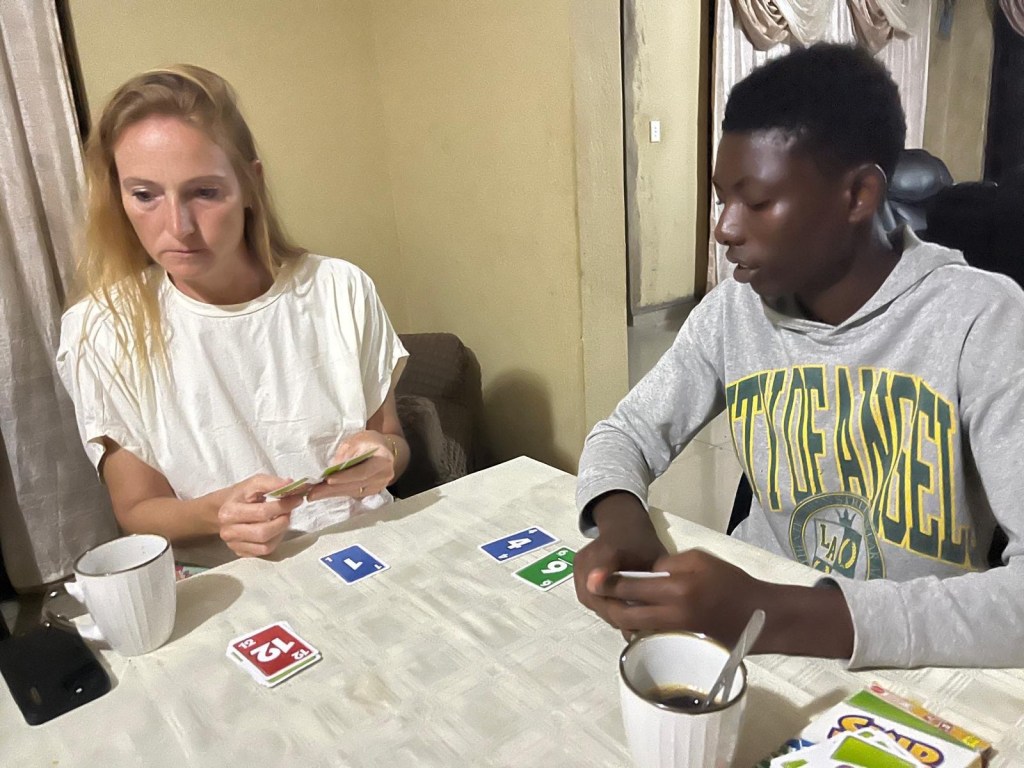 We hebben alledrie spelletjes meegenomen en na het eten stellen we voor om wat spelletjes te spelen. De opgeschoten puberjongens (17 en 19), hebben in lange tijd geen gewone spelletjes gespeeld, en sluiten graag aan. De dames van het gezin verkassen naar de woonkamer en gaan verder met het vlechten van de haren.